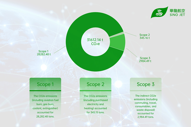 In accordance with ISO 14064-1 and with reference to the "Greenhouse Gas Protocol Corporate Accounting and Reporting Standard" set out by the World Resources Institute, Sino Jet conducted a comprehensive investigation and quantification of the company's carbon emissions base on its operations in 2021. The investigation scope widely covered aircraft trading, aircraft management, charter flights, ground handling services and fixed-base operator (FBO) management. The total Greenhouse Gas (GHG) emissions from the chain of business jet services provided by Sino Jet was found to be 31,612.14 tons, of which Scope 1 emissions (including aviation fuel burn, gas burn, coolant, extinguisher) accounted for 28,282.48 tons and Scope 2 emissions (including purchased electricity and heating) accounted for 345.15 tons and Scope 3 indirect emissions (including commuting, travel, consumables, and waste disposal) accounted for 2,984.49 tons.