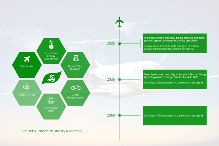 Sino Jet also seeks to drive more than 20% of its managed fleet to achieve carbon neutrality by 2025, and to achieve carbon neutrality in its entire business including aircraft management by 2035. Sino Jet also plans to incentivise green carbon neutral flight options to encourage its business partners and clients to join its carbon reduction journey.