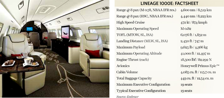 This ultra-large jet’s exceptional high-dispatch reliability has been proven by more than eight million hours of flight time on the Lineage 1000E and E-Jets platform