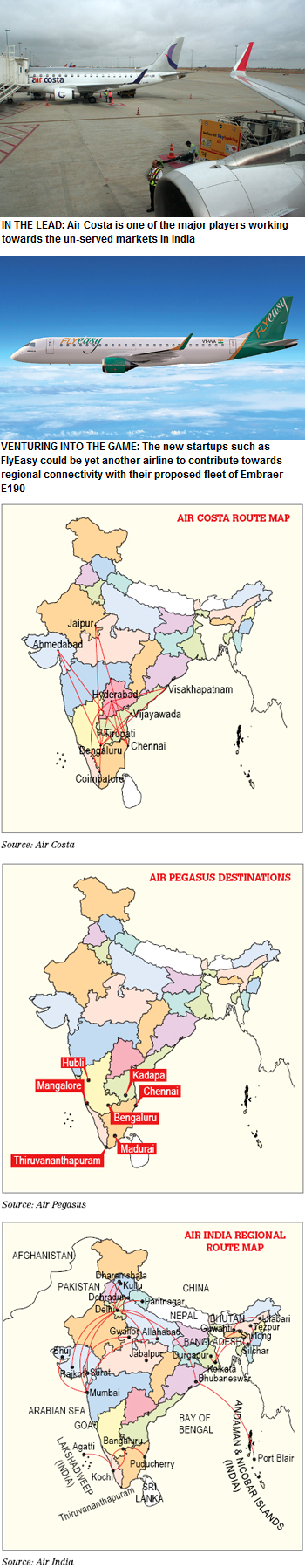 The next regional airline – Vijayawada-based Air Costa connects nine destinations (Vijayawada, Hyderabad, Vizag, Tirupati, Bengaluru, Chennai, Coimbatore, Ahmedabad and Jaipur). At the time of writing it had a depleted fleet level of two Embraer E-190 with two E-170s having been returned to lessors recently. The company has plans of going national and would require a minimum of five aircraft and it has planned accordingly. In fact, in October 2014 during its first anniversary celebrations, its Chairman Ramesh Lingamaneni had talked about connecting regional destinations from various hubs in the other three zones. With Air Costa and the other two regional players – Air Pegasus and Trujet – Southern India seems fairly connected by regional aviation Air Costa has announced that it has got the no objection certification from MoCA for pan-India operations and that it would be starting the same in summer of 2016. The new destinations it will be connecting include Delhi, Pune, Bhubaneshwar and Varanasi.